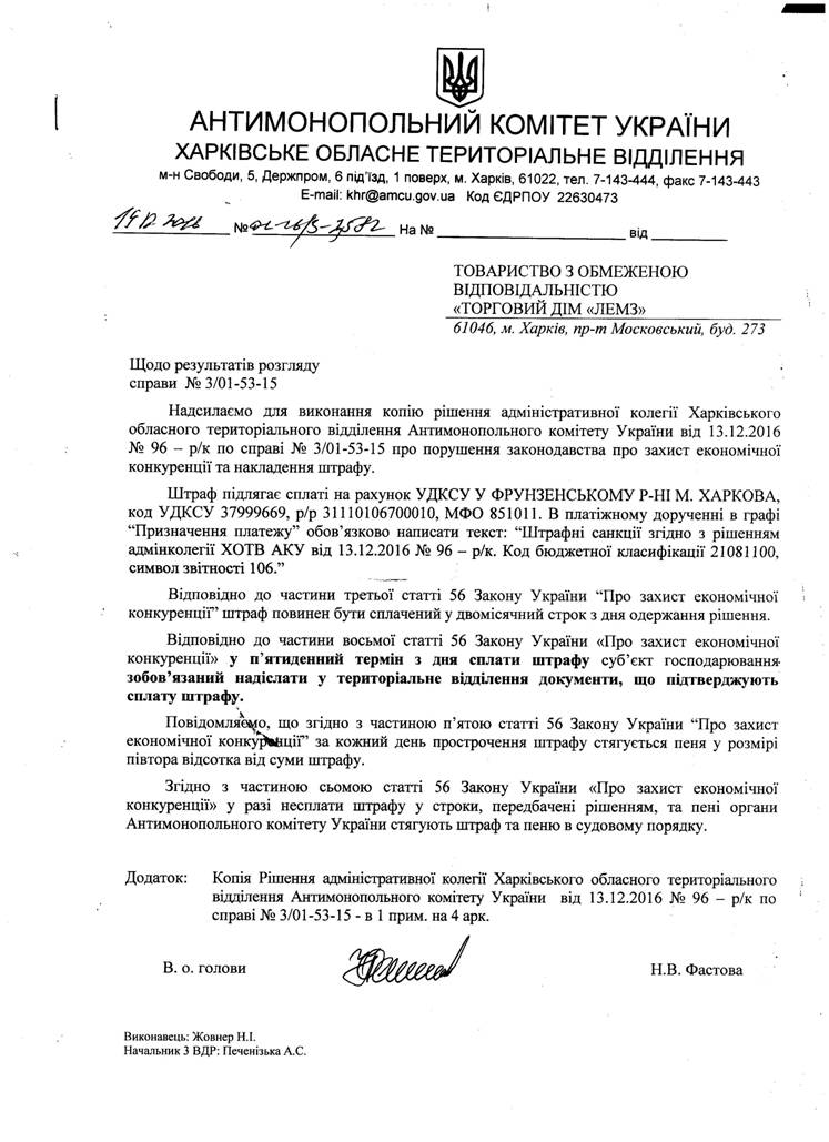ІНФОРМАЦІЯ ЩОДО РІШЕННЯ ВІД 13.12.2016 № 96-Р/К У СПРАВІ № 3/01-53-15 ПРО ПОРУШЕННЯ ТОВ "ТОРГОВИЙ ДІМ "ЛЕМЗ" ТА ТОВ "ЄВРОТРАНСМАШ" ЗАКОНОДАВСТВА ПРО ЗАХИСТ ЕКОНОМІЧНОЇ КОНКУРЕНЦІЇ