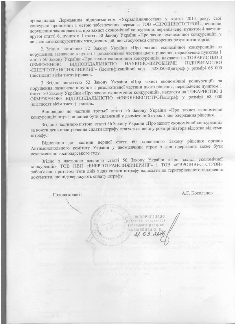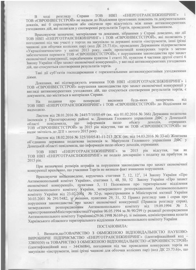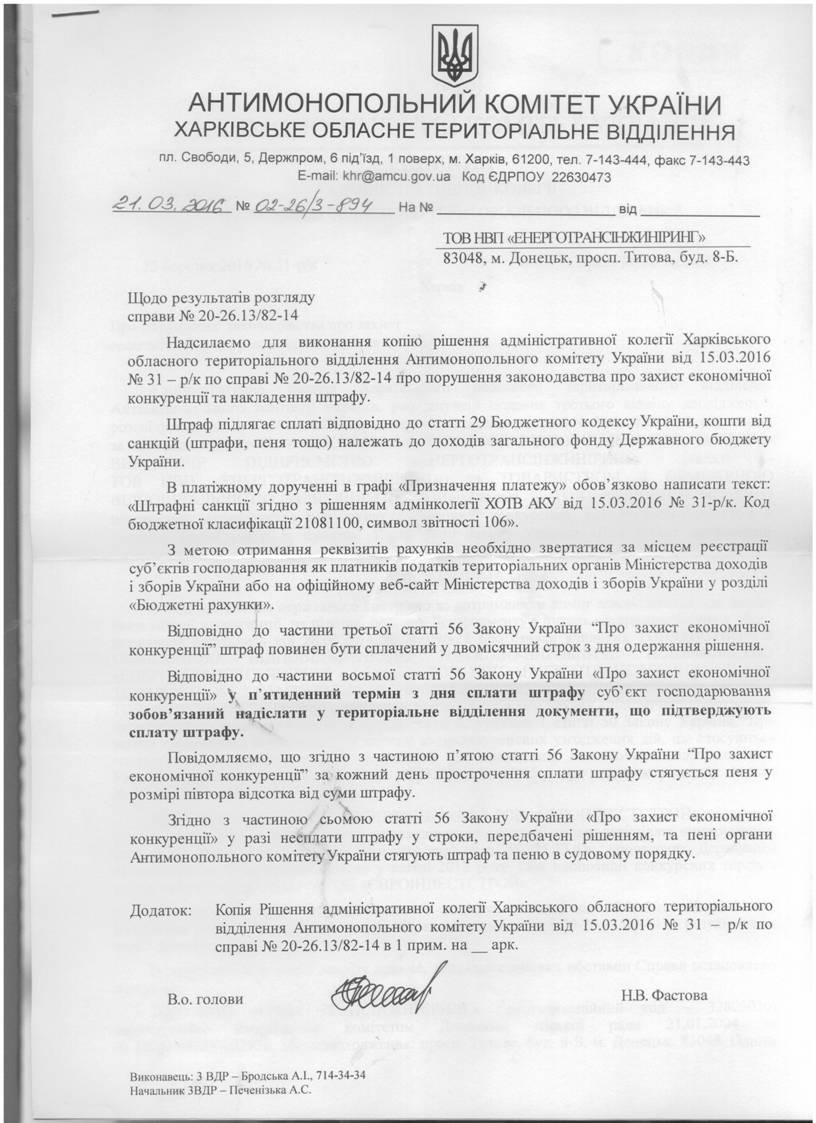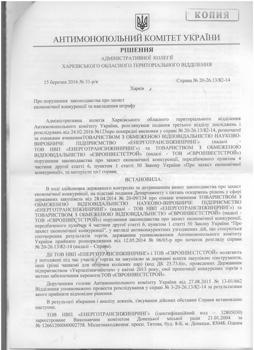 ІНФОРМАЦІЯ ЩОДО РІШЕННЯ ВІД 15.03.2016 № 31-Р/К У СПРАВІ № 20-26.13/82-14 ПРО ПОРУШЕННЯ ЗАКОНОДАВСТВА ПРО ЗАХИСТ ЕКОНОМІЧНОЇ КОНКУРЕНЦІЇ З БОКУ ТОВ НВП "ЕНЕРГОТРАНСАІНЖИРИНГ" ТА ТОВ "ЄВРОІНВЕСТСТРОЙ"