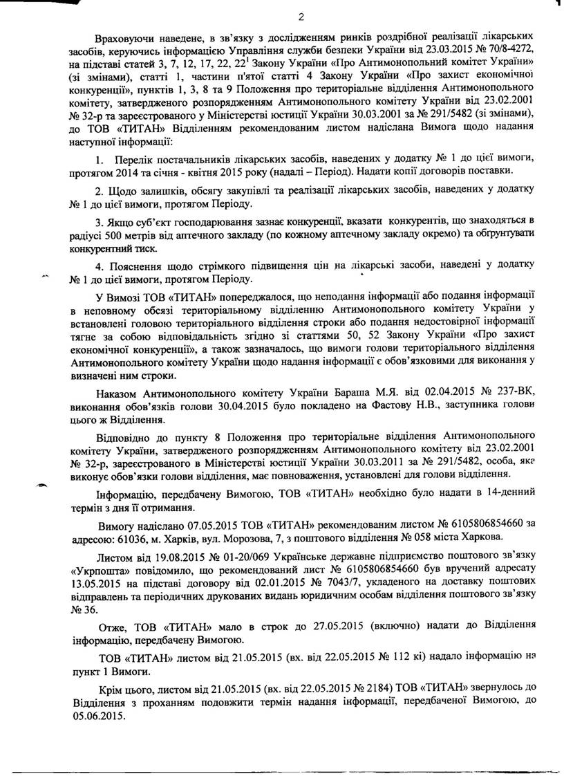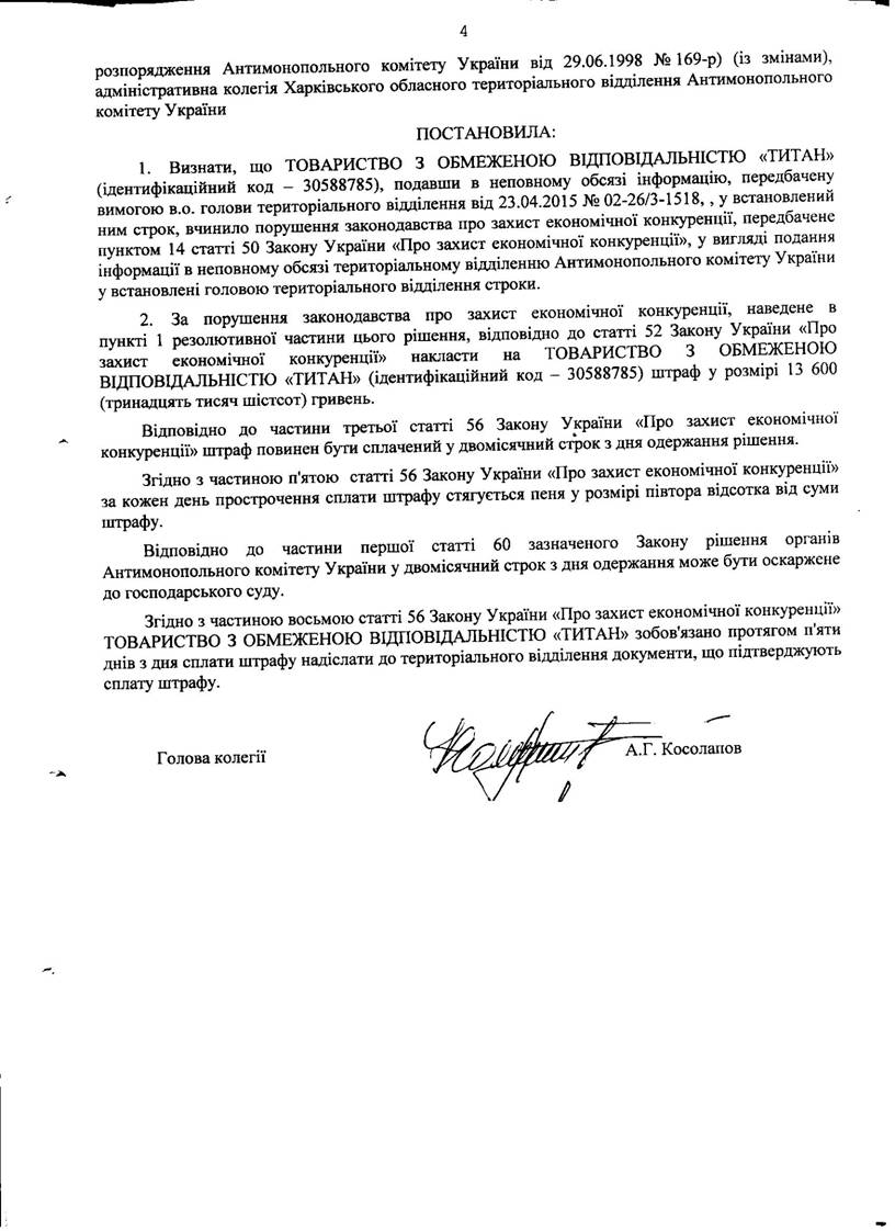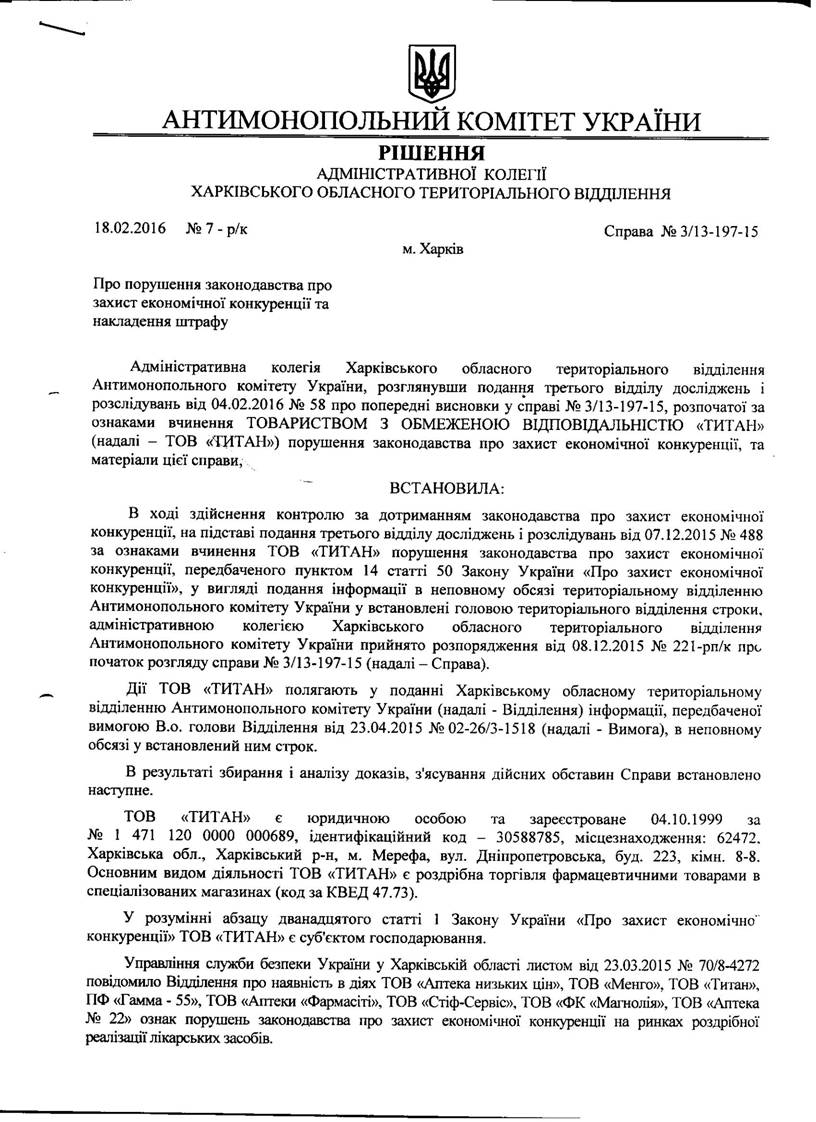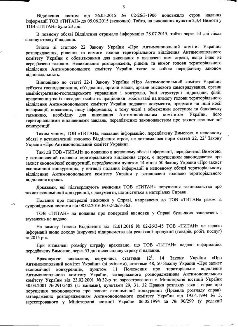 ІНФОРМАЦІЯ ЩОДО РІШЕННЯ ВІД 18.02.2016 № 7-Р/К У СПРАВІ № 3/13-197-15 ПРО ПОРУШЕННЯ ЗАКОНОДАВСТВА ПРО ЗАХИСТ ЕКОНОМІЧНОЇ КОНКУРЕНЦІЇ З БОКУ ТОВ "ТИТАН"