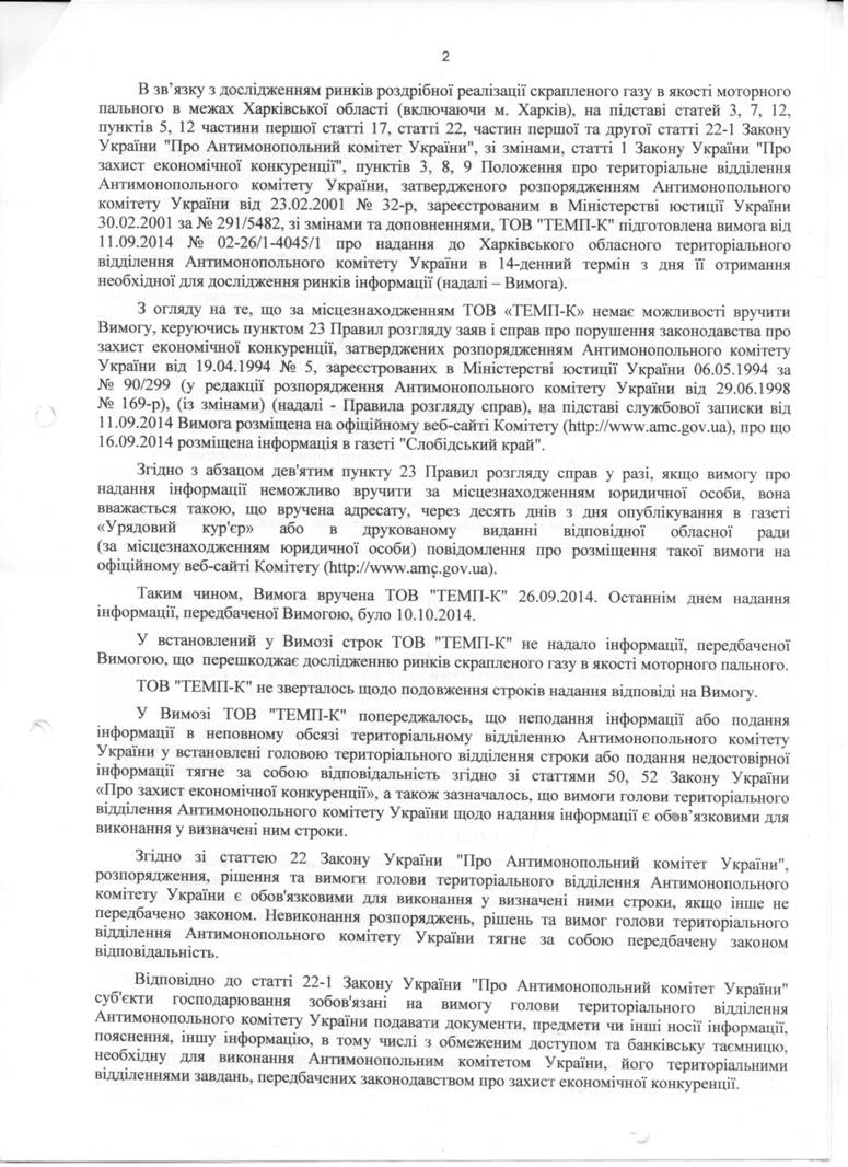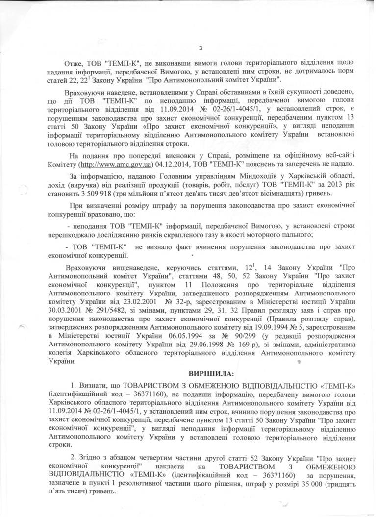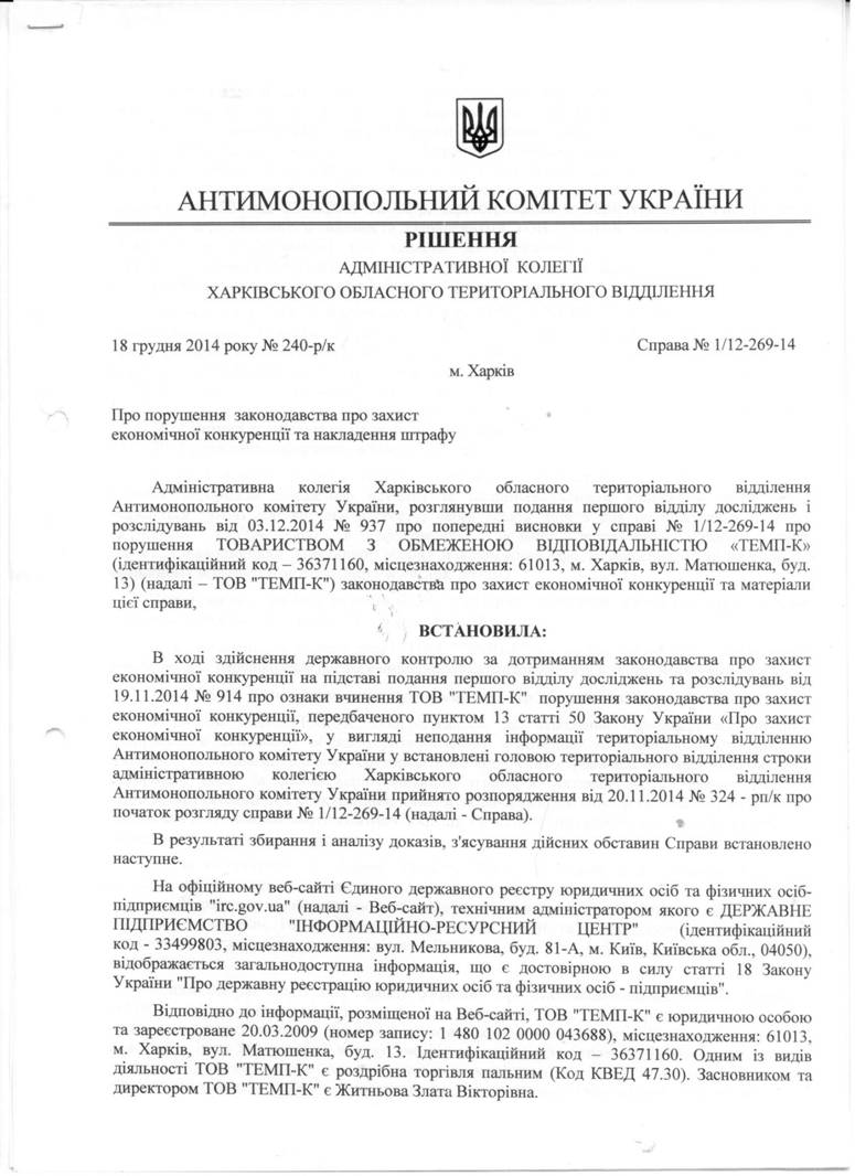 ІНФОРМАЦІЯ ЩОДО РІШЕННЯ ВІД 18.12.2014 № 240-Р/К У СПРАВІ № 1/12-269-14 ПРО ПОРУШЕННЯ ТОВАРИСТВОМ З ОБМЕЖЕНОЮ ВІДПОВІДАЛЬНІСТЮ "ТЕМП-К" ЗАКОНОДАВСТВА ПРО ЗАХИСТ ЕКОНОМІЧНОЇ КОНКУРЕНЦІЇ