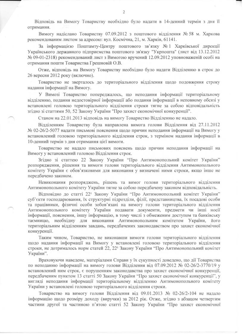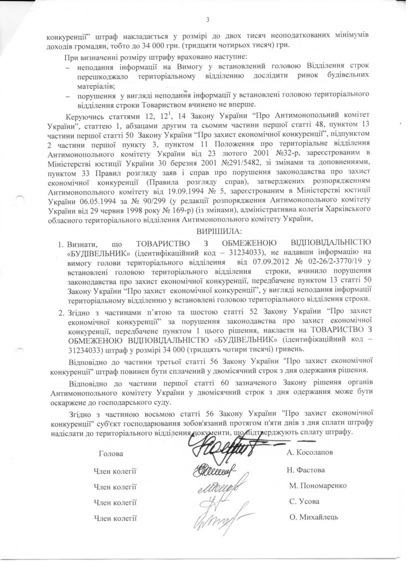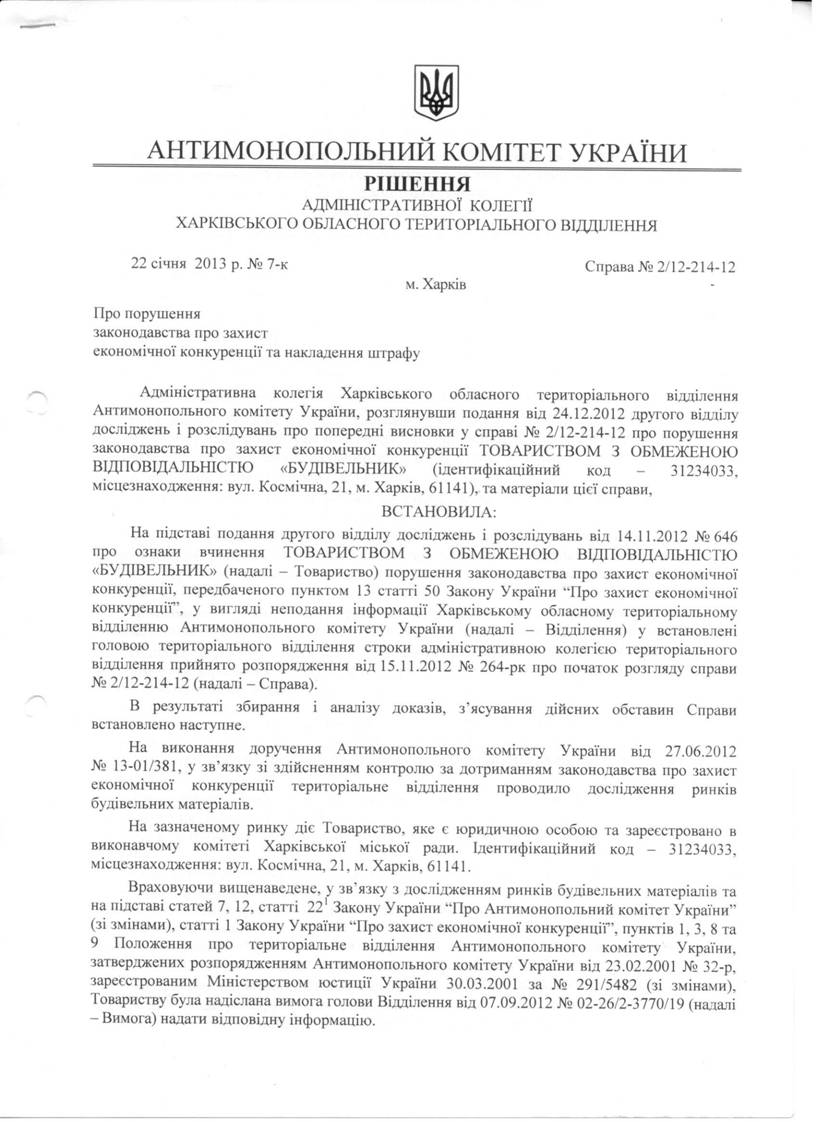 ІНФОРМАЦІЯ ЩОДО РІШЕННЯ ВІД 22.01.2013 № 7-к У СПРАВІ № 2/12-214-12 ПРО ПОРУШЕННЯ ЗАКОНОДАВСТВА ПРО ЗАХИСТ ЕКОНОМІЧНОЇ КОНКУРЕНЦІЇ З БОКУ ТОВ "БУДІВЕЛЬНИК"