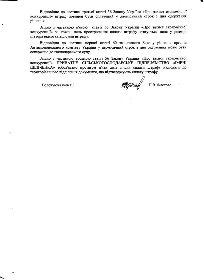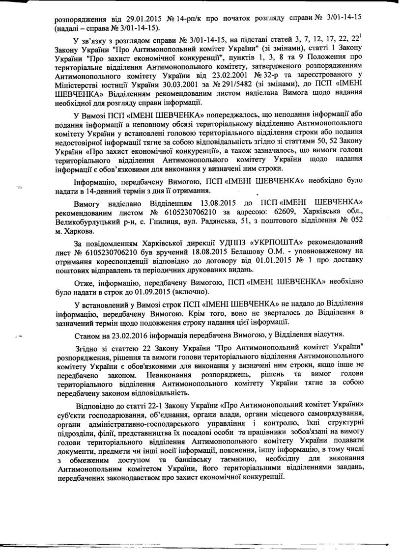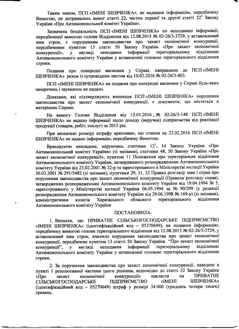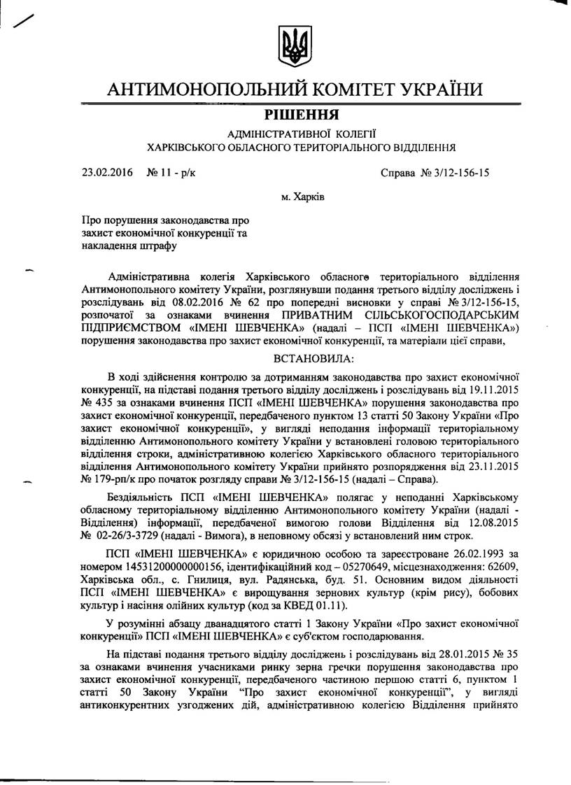 ІНФОРМАЦІЯ ЩОДО РІШЕННЯ ВІД 23.02.2016 № 11-Р/К У СПРАВІ № 3/12-156-15 ПРО ПОРУШЕННЯ ЗАКОНОДАСТВА ПРО ЗАХИСТ ЕКОНОМІЧНОЇ КОНКУРЕНЦІЇ З БОКУ ПСП "ІМЕНІ ШЕВЧЕНКА"