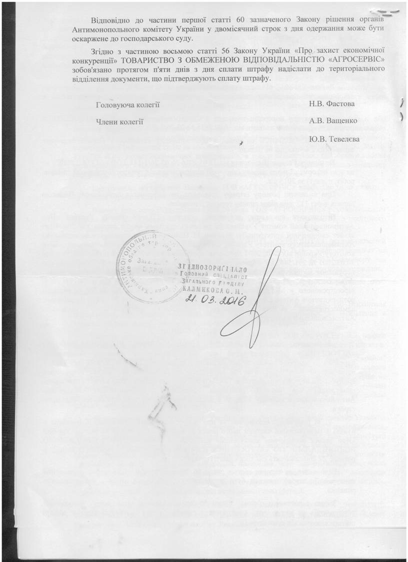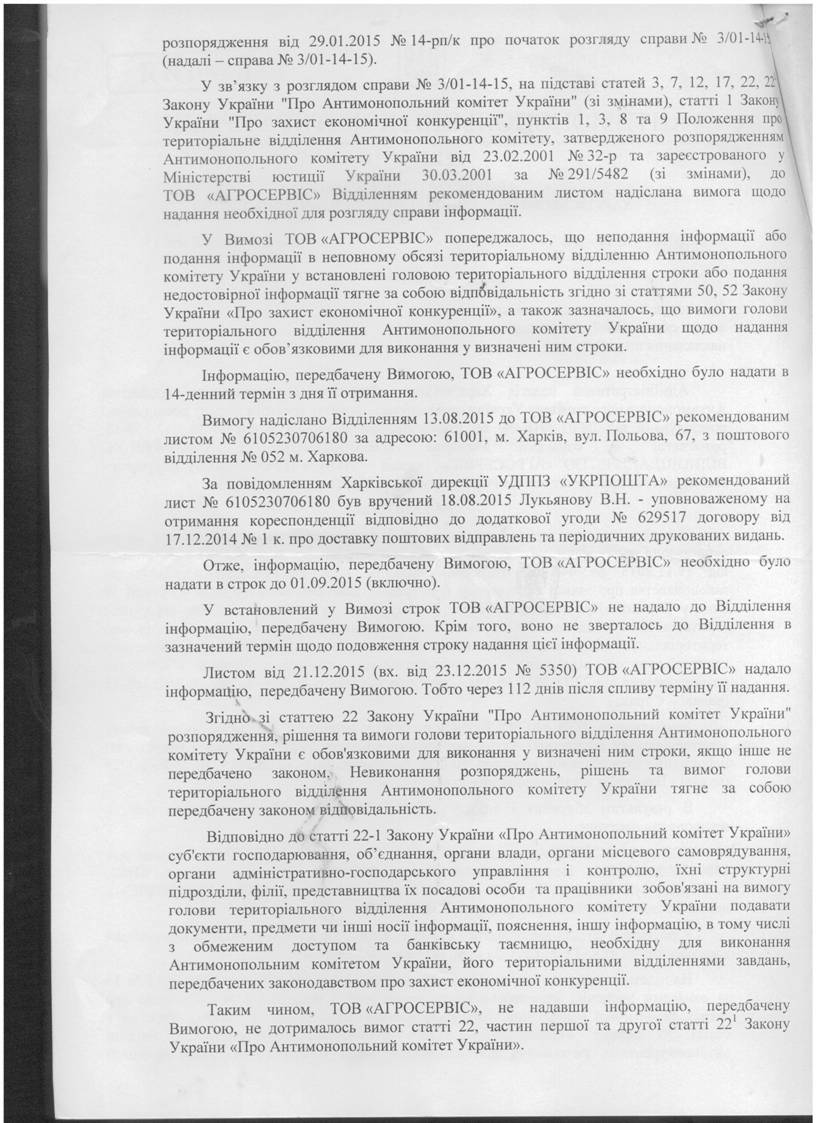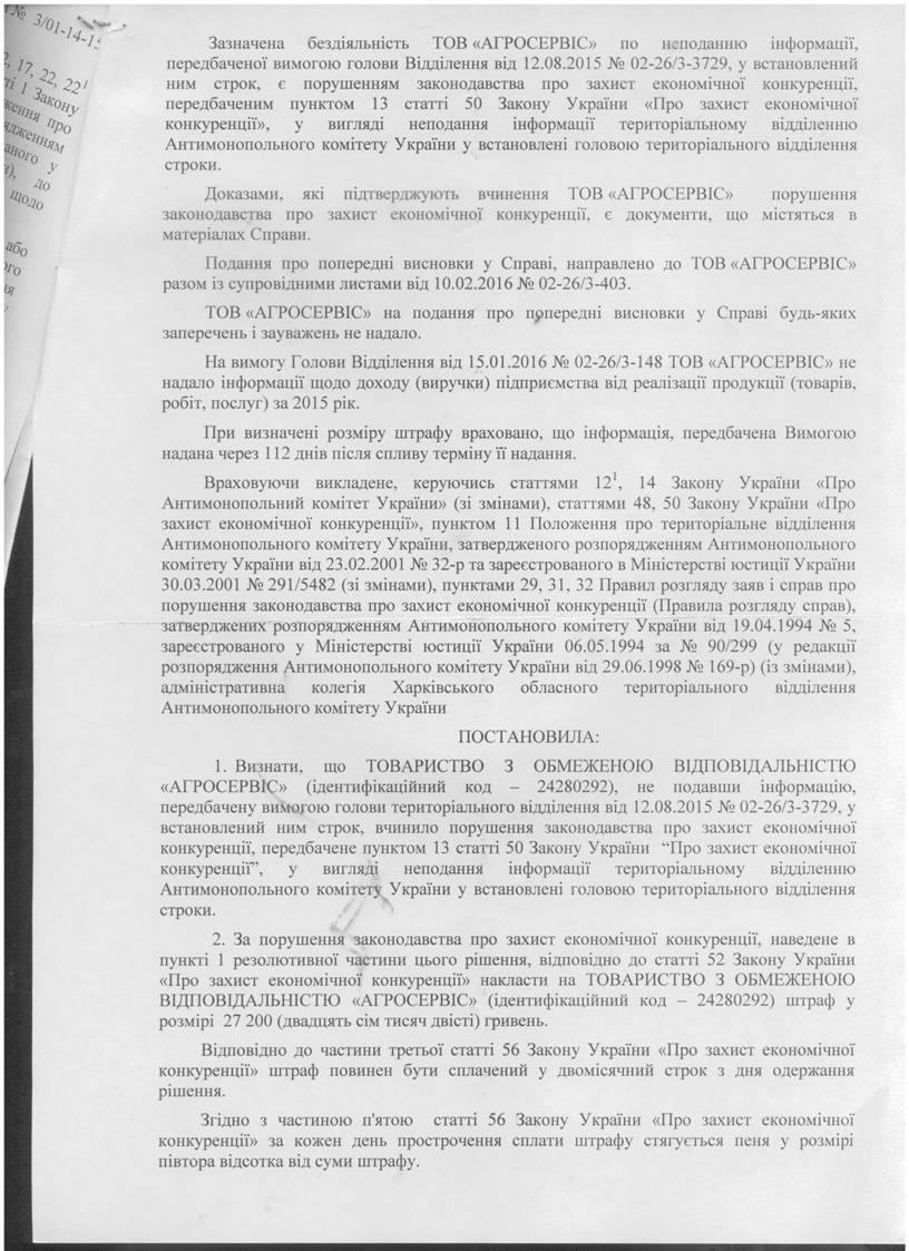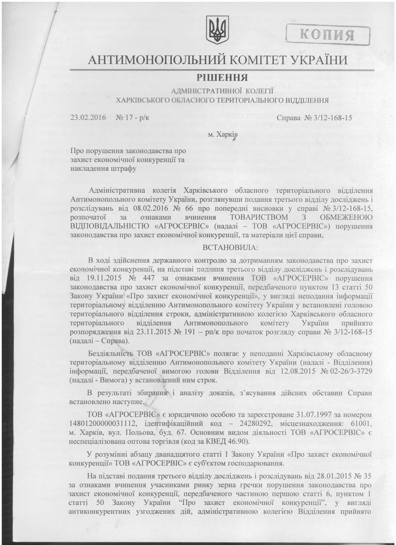 ІНФОРМАЦІЯ ЩОДО РІШЕННЯ ВІД 23.02.2016 № 17-Р/К У СПРАВІ № 3/12-168-15 ПРО ПОРУШЕННЯ ЗАКОНОДАВСТВА ПРО ЗАХИСТ ЕКОНОМІЧНОЇ КОНКУРЕНЦІЇ З БОКУ ТОВ "АГРОСЕРВІС"