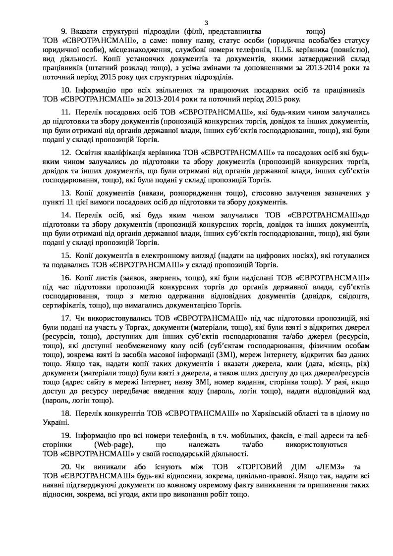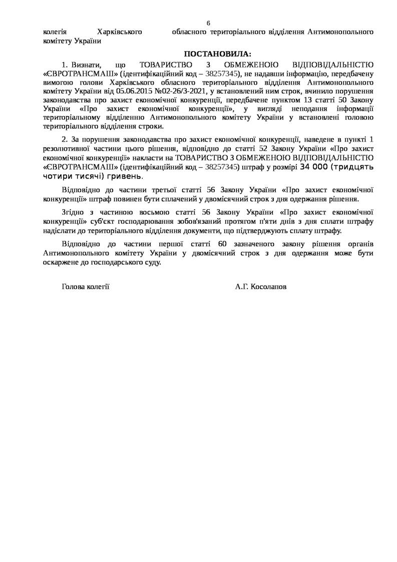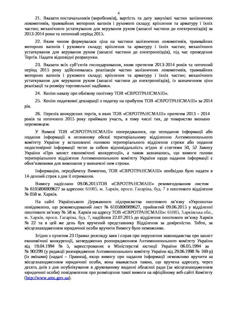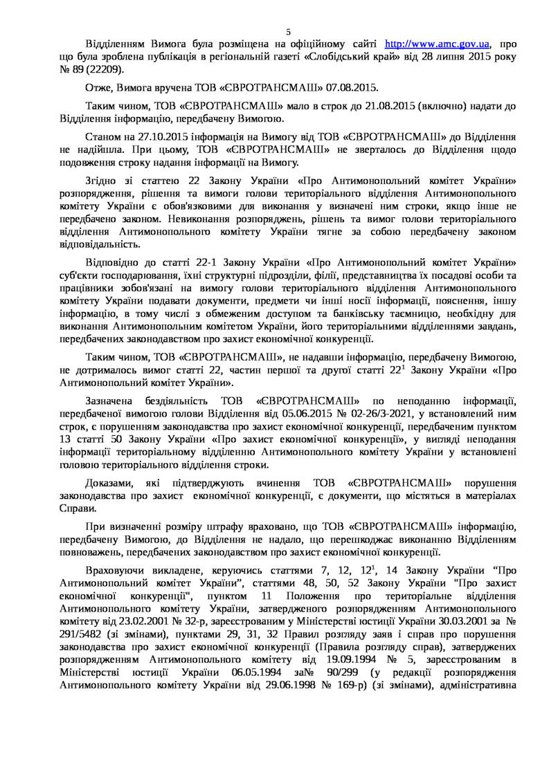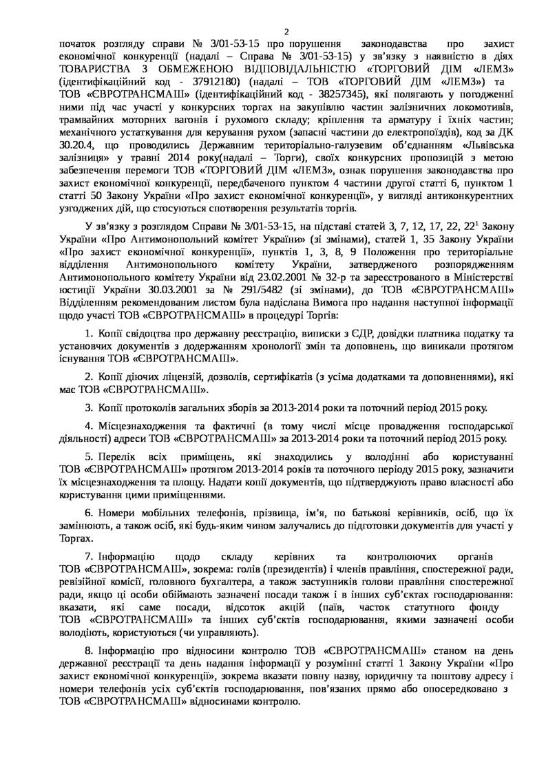 ІНФОРМАЦІЯ ЩОДО РІШЕННЯ ВІД 27.10.2015 № 127-Р/К У СПРАВІ № 3/12-97-15 ПРО ПОРУШЕННЯ ЗАКОНОДАВСТВА ПРО ЗАХИСТ ЕКОНОМІЧНОЇ КОНКУРЕНЦІЇ З БОКУ ТОВ "ЄВРОТРАНСМАШ"
