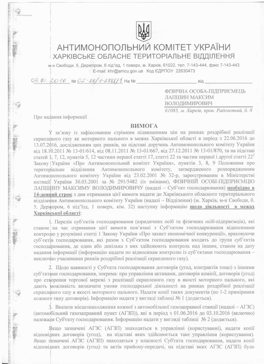 ВИМОГА ВІД 03.10.2016 № 02-26/1-2788/6 ДО ФОП МАСЛІЙ М.М.