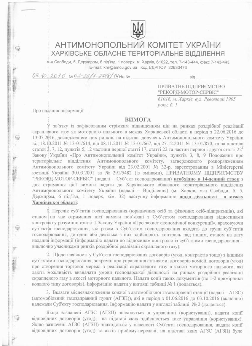 ВИМОГА ВІД 03.10.2016 № 02-26/1-2788/12 ДО ПП "РЕАЛ-НАФТОСЕРВІС"