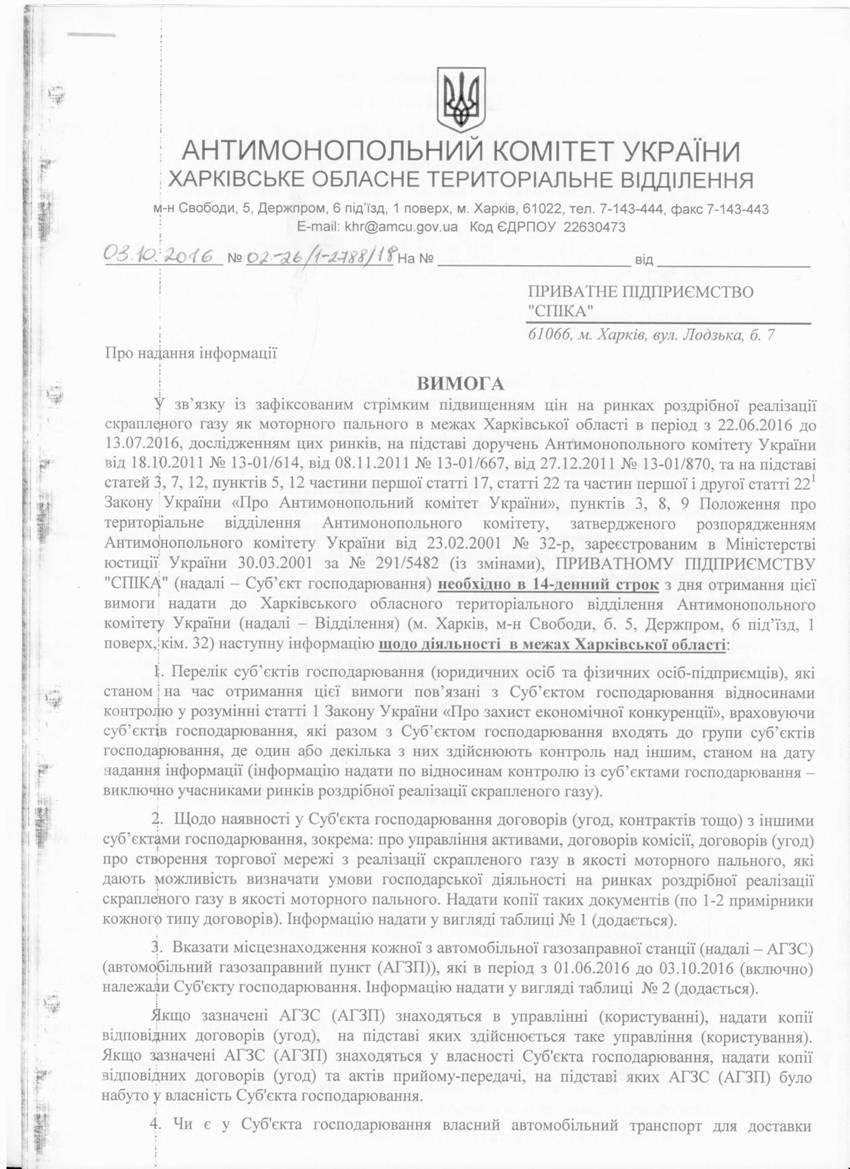 ВИМОГА ВІД 03.10.2016 № 02-26/1-2788/11 ДО ТОВ "СПІКА-ОИЛ"