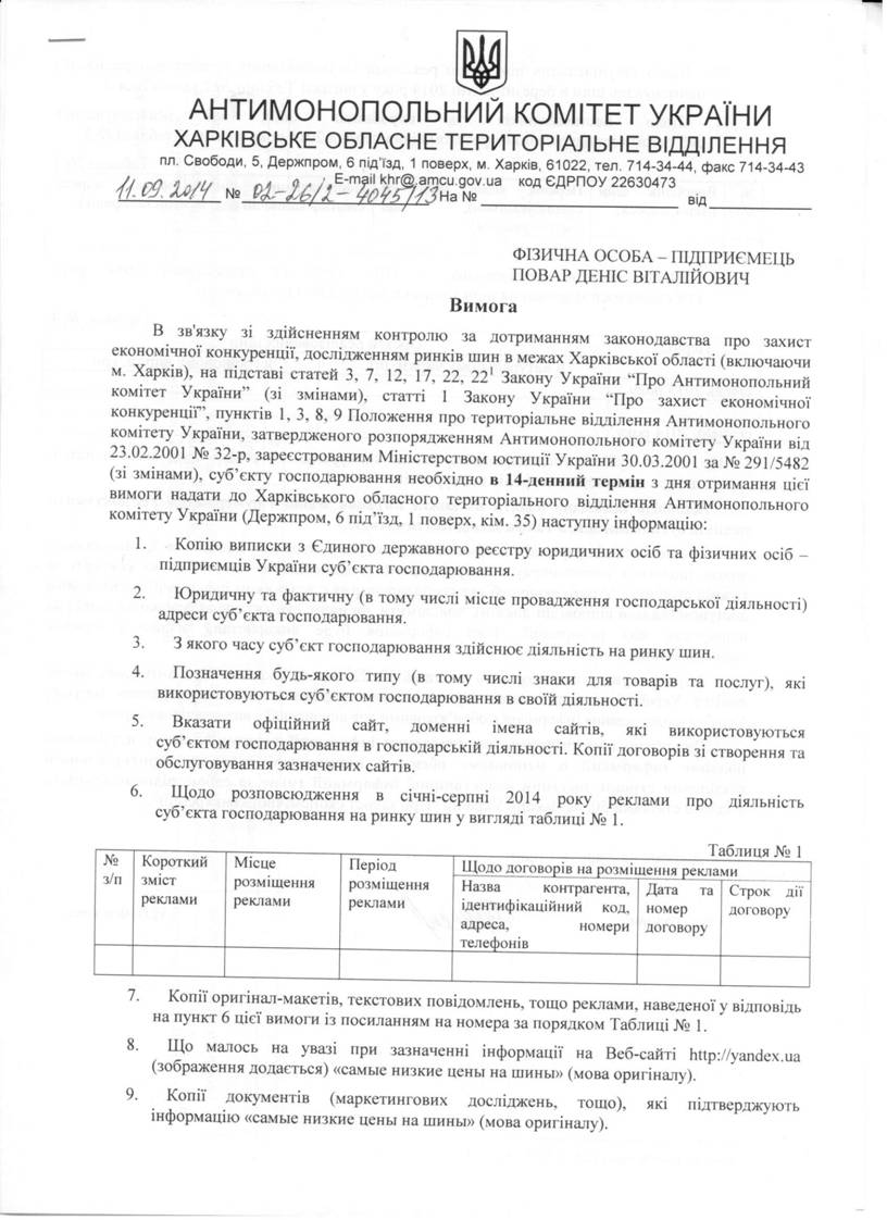 ВИМОГА ВІД 11.09.2014 № 02-26/3-4045/12 ПРО НАДАННЯ ІНФОРМАЦІЇ ПРИВАТНИМ ПІДПРИЄМСТВОМ ФІРМА "БРІЗ СПД"