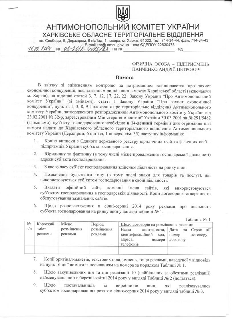 ВИМОГА ВІД 11.09.2014 № 02-26/2-4045/22 ПРО НАДАННЯ ІНФОРМАЦІЇ ФІЗИЧНОЮ ОСОБОЮ-ПІДПРИЄМЦЕМ КОМАР ЮРІЄМ ВАСИЛЬОВИЧЕМ