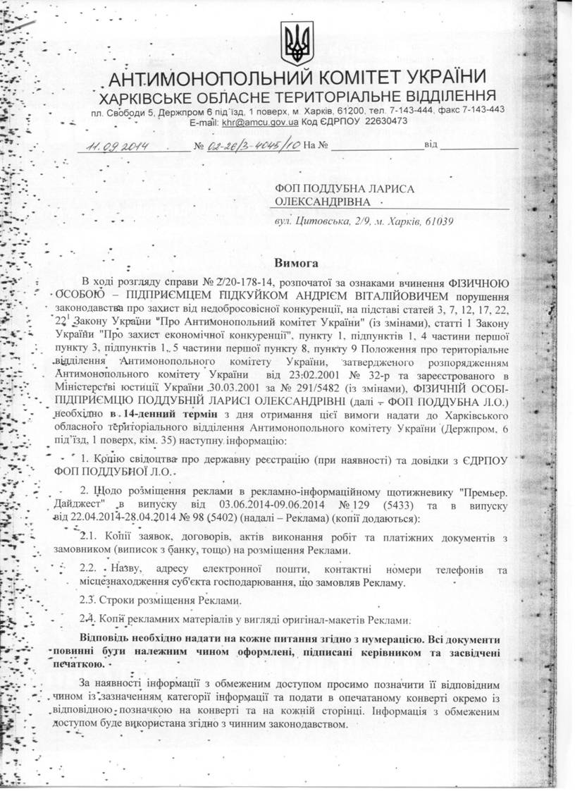 ВИМОГА ВІД 11.09.2014 № 02-26/1-4045/9 ПРО НАДАННЯ ІНФОРМАЦІЇ ПП "ОЛАН"