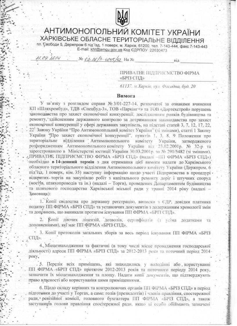ВИМОГА ВІД 11.09.2014 № 02-26/3-4045/11 ПРО НАДАННЯ ІНФОРМАЦІЇ ТОВАРИСТВОМ З ОБМЕЖЕНОЮ ВІДПОВІДАЛЬНІСТЮ "ДОРТЕХСТРОЙ"