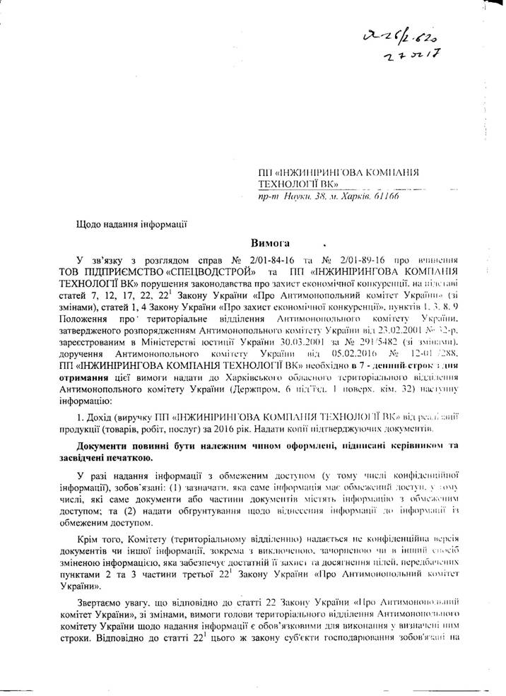 ВИМОГА ВІД 27.02.2017 № 02-26/2-621 ДО ТОВ ПІДПРИЄМСТВО "СПЕЦВОДСТРОЙ"