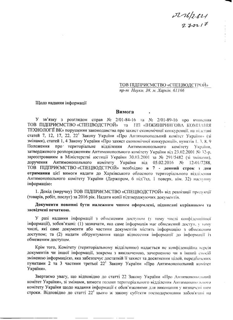 ВИМОГА ВІД 27.02.2017 № 02-26/2-620 ДО ПП "ІНЖИНІРИНГОВА КОМПАНІЯ ТЕХНОЛОГІЇ ВК"