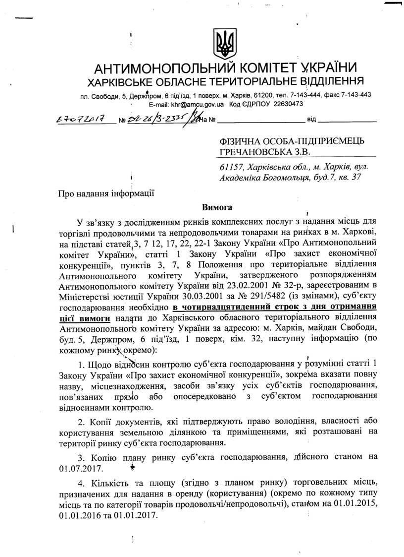 ВИМОГА ВІД 27.07.2017 № 02-26/3-2335/43 ДО ПП "СХІДНА БРАМА"