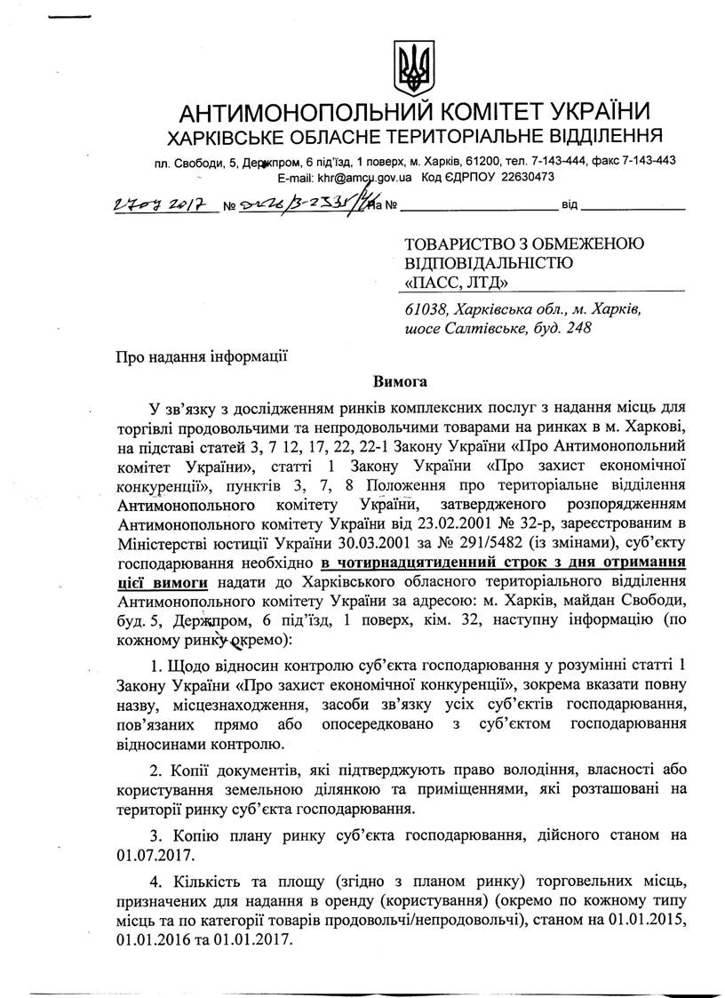 ВИМОГА ВІД 27.07.2017 № 02-26/3-2335/43 ДО ПП "СХІДНА БРАМА"