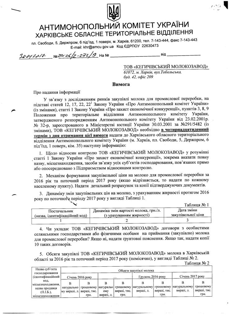ВИМОГА ВІД 30.01.2017 № 02-26/3-272/1 ДО ТОВ "МОЛОЧНИЙ СВІТ"