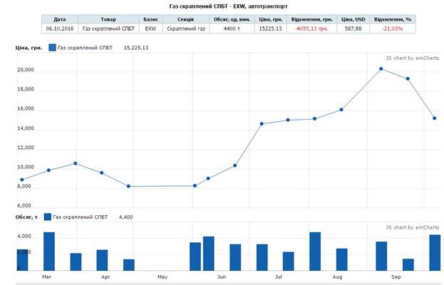 Відповідно до інформації товарної біржі «Українська енергетична біржа», розміщеної на її офіційному сайті (електронна адреса – https://www.ueex.com.ua/ukr/), ціни, за якими здійснювалась реалізація скрапленого газу марки СПБТ у якості моторного пального на аукціонах біржі у липні 2016 року, коливалась у межах 14 650,81 - 15 033,94 грн./т., у серпні 2016 року – 15 166,80 – 16 115,14 грн./т., у вересні 19 280,26 – 20 313,70 грн./т.