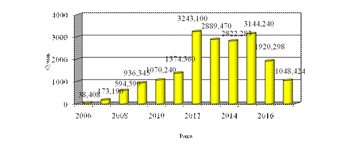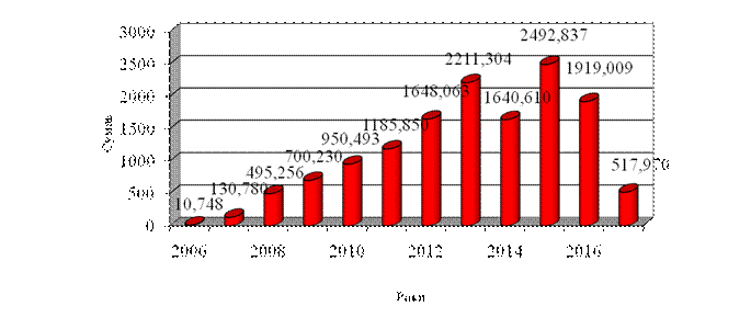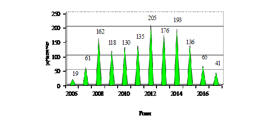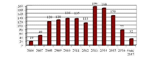 Рис. 1. Кількість заяв та подань одержаних Полтавським ОТВ АМКУ протягом 2007-2017 рр., всього – 1803 заяв та подань.