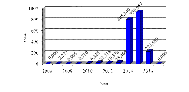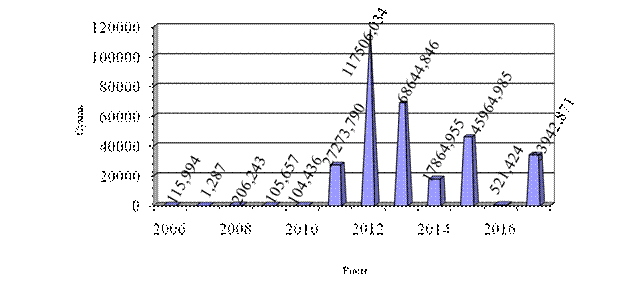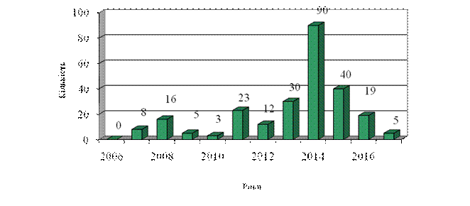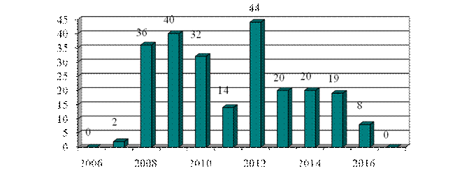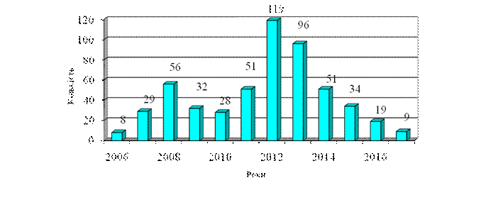 Рис. 5. Кількість порушень конкурентного законодавства, передбачених п. 2 ст. 50 Закону України “Про захист економічної конкуренції” виявлених Полтавським ОТВ АМКУ за 2007-2017 рр., всього – 524 порушень.