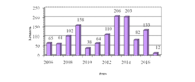 Рис. 2. Кількість справ, розпочатих за результатами перевірок, розгляду заяв, подань та за власною ініціативою Полтавським ОТВ АМКУ у 2006-2016 рр., всього – 1324 справи.
